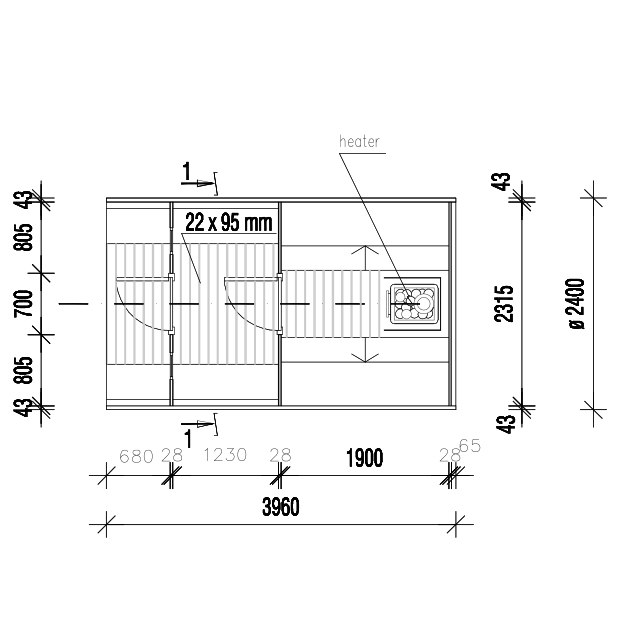 - Sisseehitatud puidust pinke leiliruumis, eesruumis ja terrassil